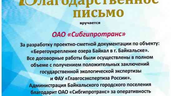 Положительное заключение Государственной экспертизы В январе 2025г. для объекта капитального строительства «Берегоукрепление озера Байкал в г. Байкальске» Российская Федерация, Иркутская область, Слюдянский муниципальный район, Байкальское городское поселение, г. Байкальск получено положительное заключение ФАУ «Главгосэкспертиза России» по проектной документации и результатам инженерных изысканий.